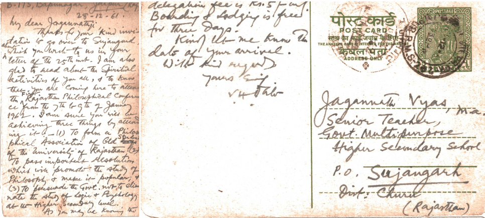 Thanks for your kind invitation to be sent to Sujangarh. You wrote to us in your letter of the 25th instant. I am also glad to hear about the spiritual activities of you all, and to know that you are coming here to attend the Rajasthan Philosophical Conference to be held on 5th & 6th January 1962. I am sure you are achieving nice things in Sujangarh and to form a Philosophical Association is a good sign of the university of Rajasthan to spread important literature which will promote the study of philosophy and make for better understanding and culture.